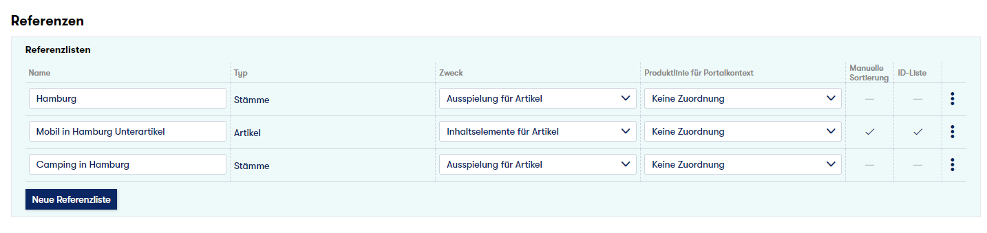 Bisher konnten Redakteure neue Referenzlisten nur anlegen. Um mehrere Anwendungsfälle abzudecken, haben wir den Funktionsumfang der Referenzlisten für Redakteure erweitert. Jetzt können statische Referenzlisten direkt aus der Listenübersicht bearbeiteten/geändert, gespeichert und gelöscht werden sowie neue Referenzlisten über die Listenaktion/Auswahl erstellt werden. Auch die Filter an den dynamischen Referenzlisten lassen sich nachträglich ändern.