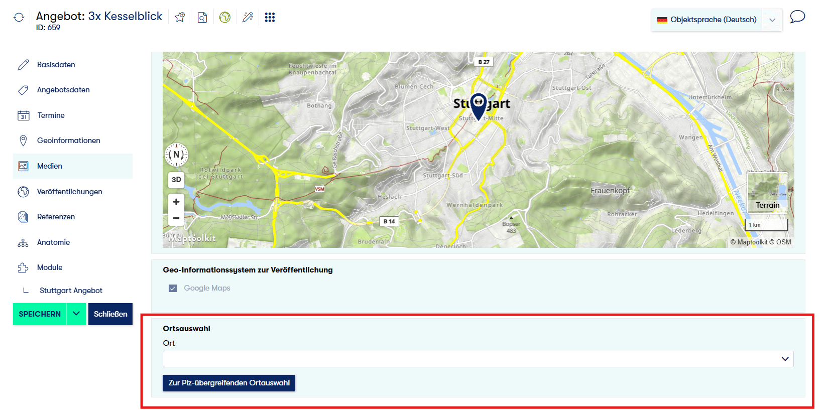 Bei Angeboten ist nun auch die Ortsauswahl verfügbar, wie es bei Stämmen bereits bekannt ist. Darüber können Orte verknüpft werden, die dann bei der Indexierung in imx.Search (z. B. für Suchobjekte) priorisiert werden, vor dem Ort des Anbieters.