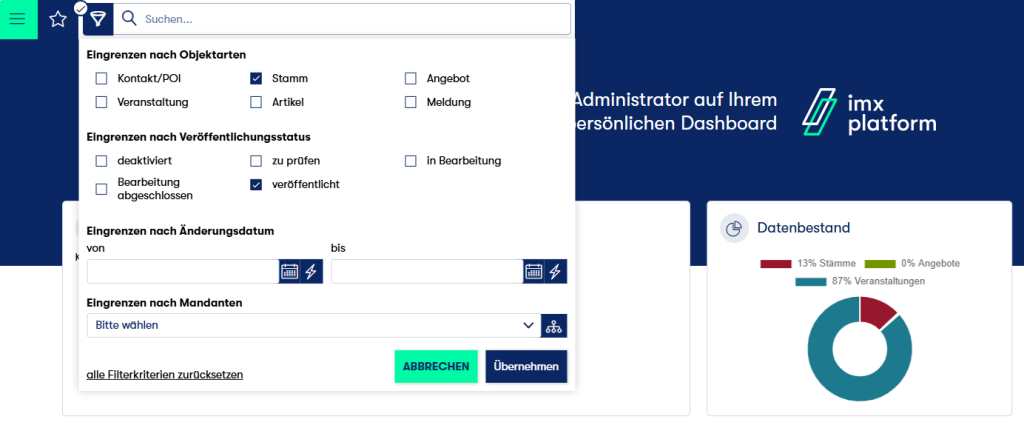 Mit den aktuellen Produkt-Updates unserer imx.Platform, des Partner Clients und der Whitelabel Widgets setzen wir den nächsten Schritt in Richtung noch mehr Effizienz, Transparenz und Nutzerfreundlichkeit. Neue Module, überarbeitete Interfaces und erweiterte Funktionen unterstützen Sie dabei, Inhalte schneller zu pflegen, Partner besser einzubinden und digitale Angebote wirkungsvoller auszuspielen.