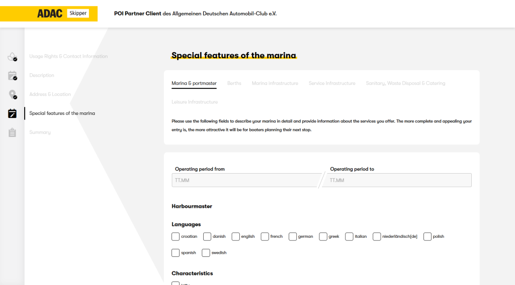 Die Basisvariante des POI-Partner Clients kann für Kunden individualisiert werden hinsichtlich Branding und der Interface-Sprache. Bei Bedarf kann die Anwendung für spezifische Module erweitert werden – ein Beispiel ist hier der Partner Client des ADAC, der zur Aktualisierung und Pflege der Marina-Daten eingesetzt wird.