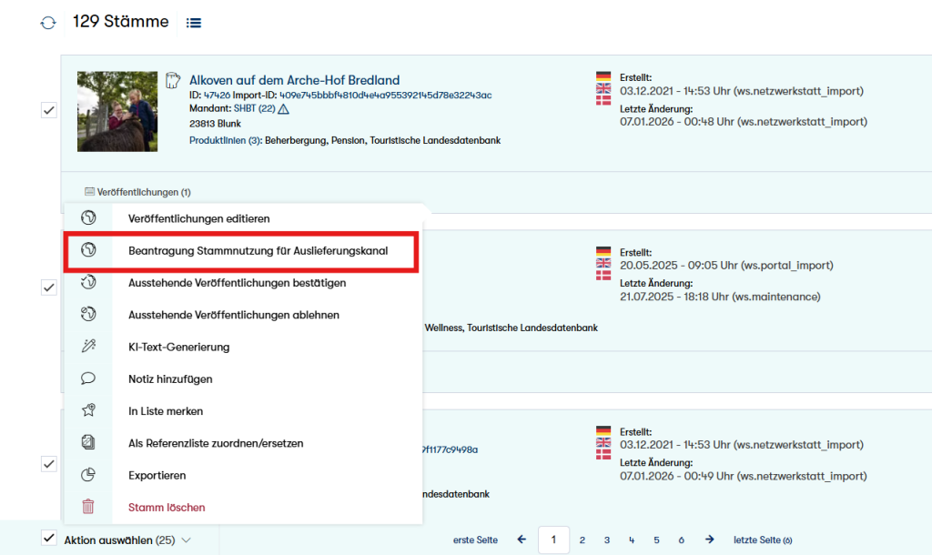Wenn Sie unsere Funktion zum Stämme teilen nutzen, können Sie darüber Objekte eines anderen Mandanten für Ihren eigenen Auslieferungskanal anfragen. Dies steht nun als Listenaktion zur Verfügung und kann so für mehrere Stämme gleichzeitig erfolgen.