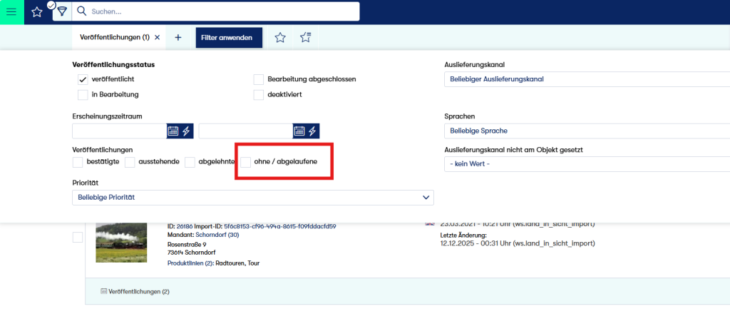 Zur besseren Qualitätskontrolle ist es nun möglich, im Bereich „Veröffentlichungen“ nach Objekten zu filtern, die keine oder abgelaufene Veröffentlichungen haben.