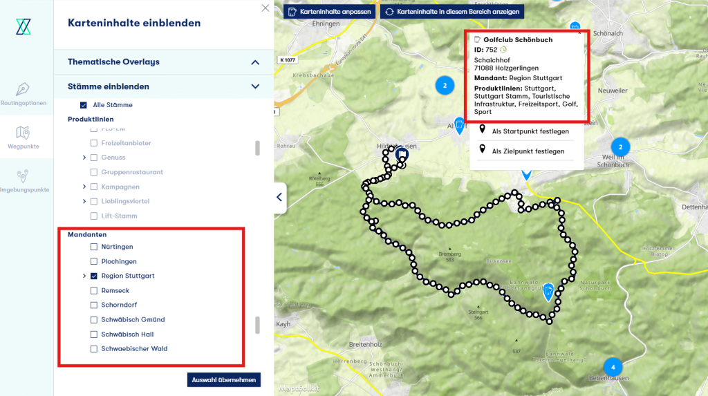 Im Touren-Editor können die POIs, die z. B. für die Weg- oder Umgebungspunkte eingeblendet werden können, nun zusätzlich zu den Produktlinien auch nach Mandanten gefiltert werden. Außerdem wurde der Mandant als zusätzliche Information im Tooltip aufgenommen.