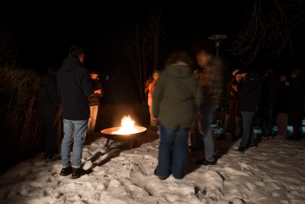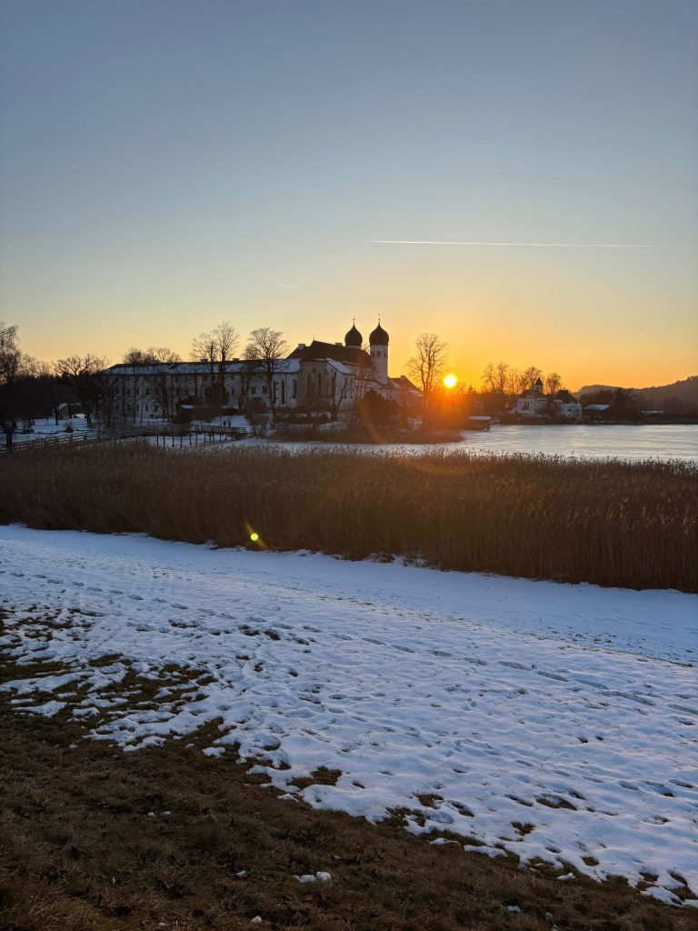 Herrliches Winterwetter erwartet uns am Kloster Seeon, der wunderschönen und historischen Location für unseren Jahresauftakt. Auf dem zugefrorenen See drehen Schlittschuhläufer ihre Kreise, während die Sonne hinter den Spitzen der Klosterkirche versinkt. Fast schon zu schön, um wahr zu sein. Da kommt ein leckerer Aperitif an der Feuerschale gerade recht, um den frostigen Winter in der Dämmerung zu genießen.