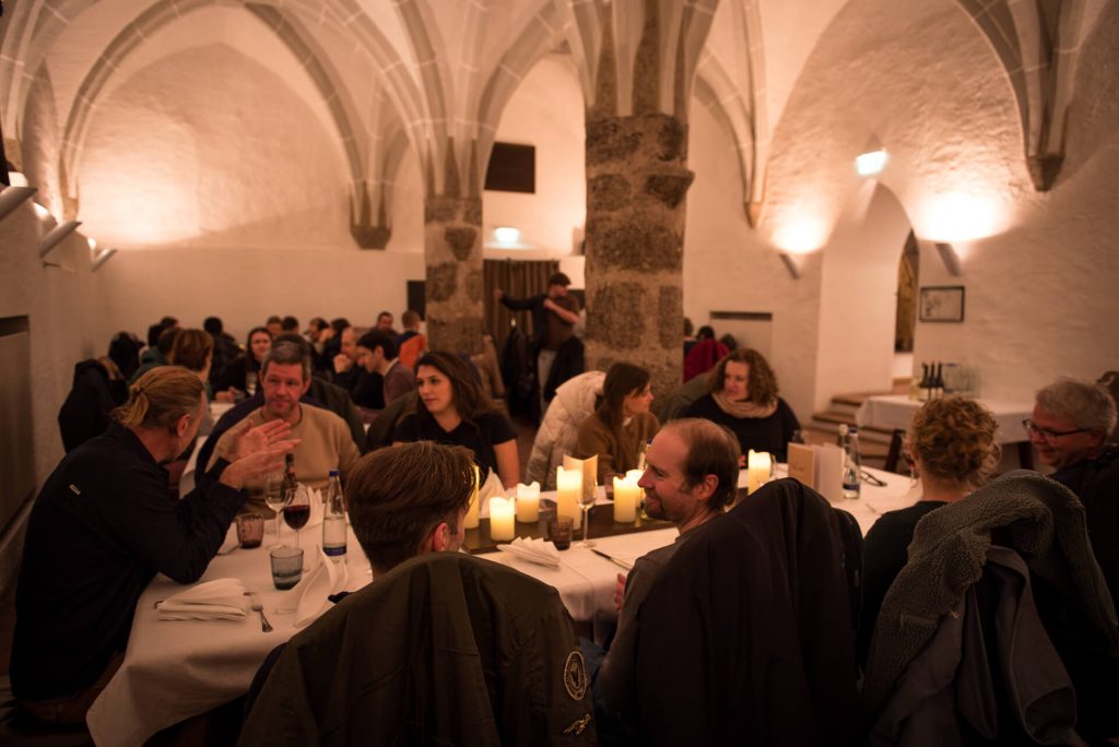 Gemütlich warm wird es beim Abendessen im Gotischen Keller, wo uns die Klosterküche ein leckeres Buffet zaubert. Nach einem Ortswechsel in das Klosterstüberl nimmt der Abend so richtig Fahrt auf: Die Kegelbahn lädt zu einem Teamduell und das Drama beginnt. Auch zwei Stunden später ist es niemandem gelungen, „Alle Neune“ zu treffen – trotz sehr guter Würfe. „Es muss an der Bahn liegen“, da sind wir uns einig.