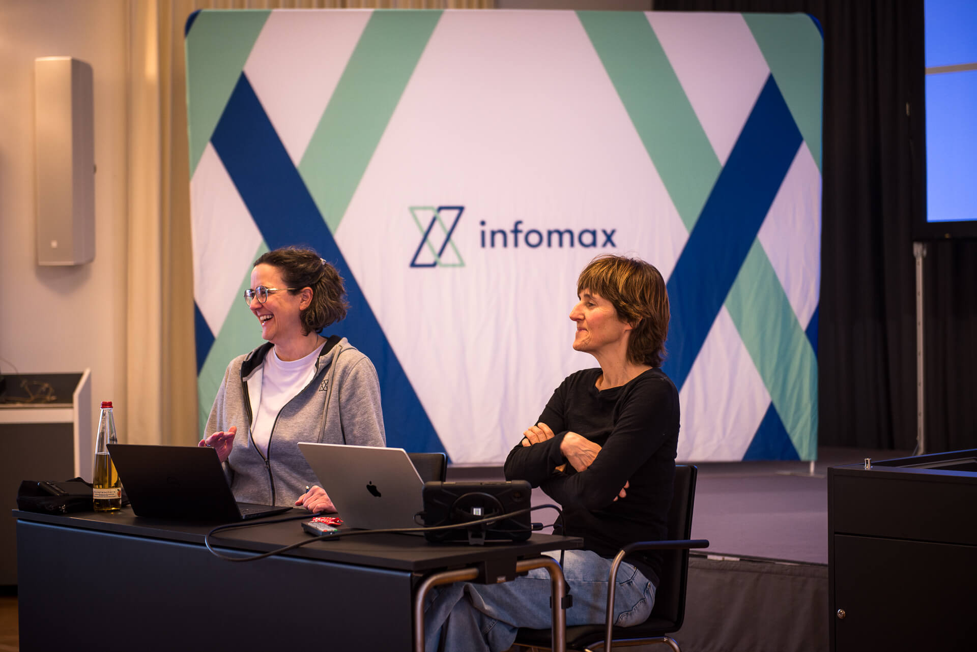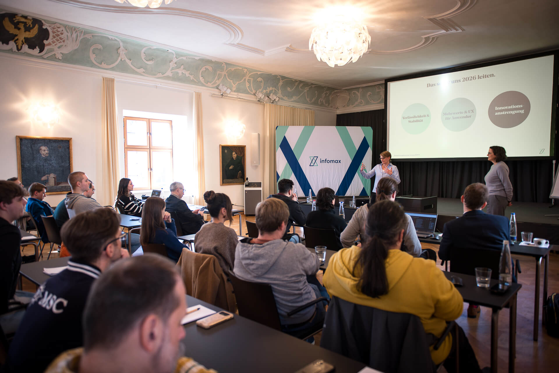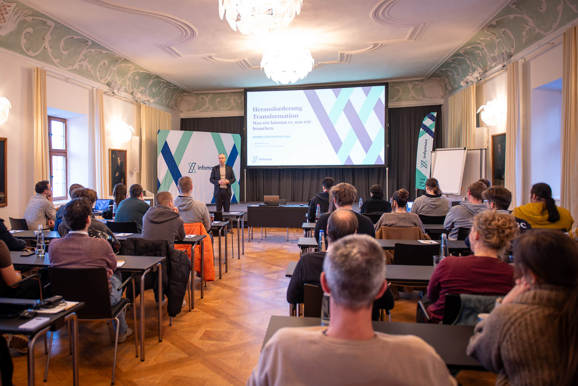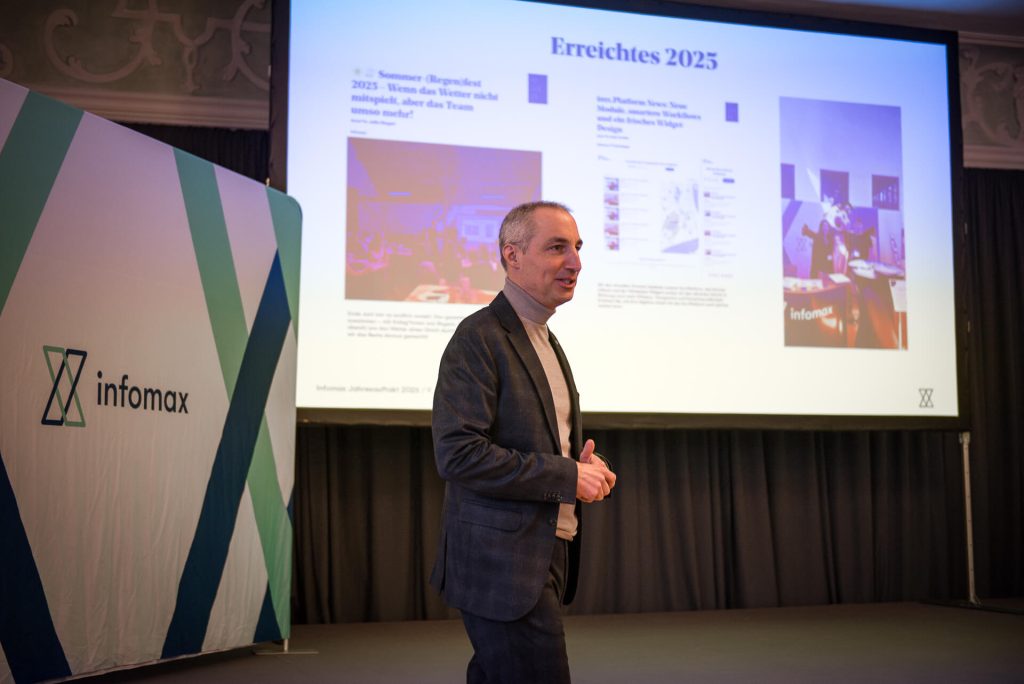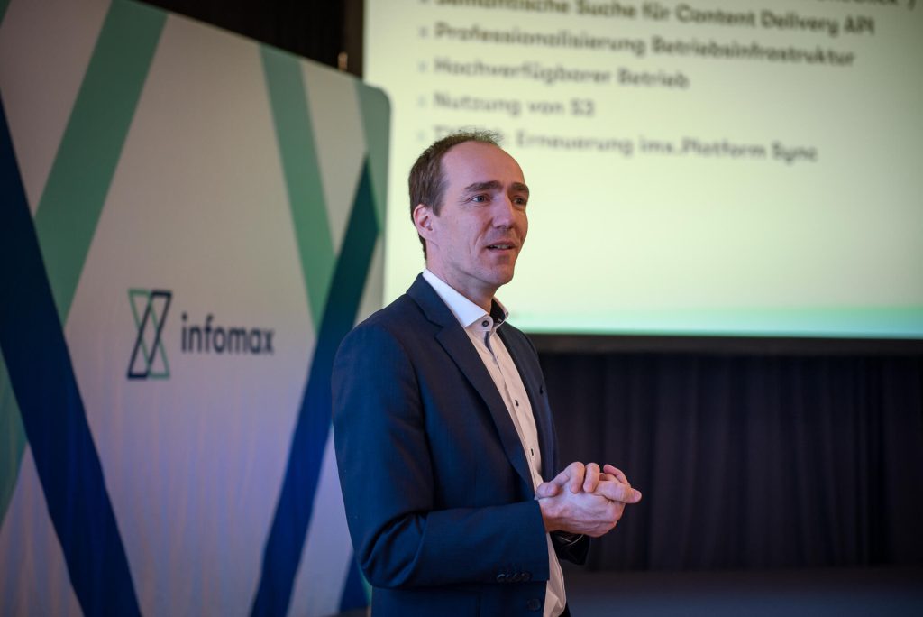 Auch die imx.Platform ist mit tollen neuen Funktionen ausgestattet und wurde über das vergangene Jahr kontinuierlich weiterentwickelt. Gleichzeitig betont Robert Klauser, dass der Erfolg von gestern das größte Risiko für morgen sein kann. Er appelliert daran, dass wir uns als infomax für die kommenden Erfolge neu aufstellen müssen – im Kleinen wie im Großen.