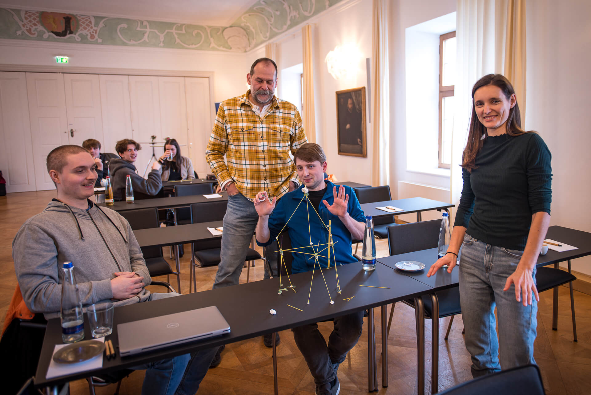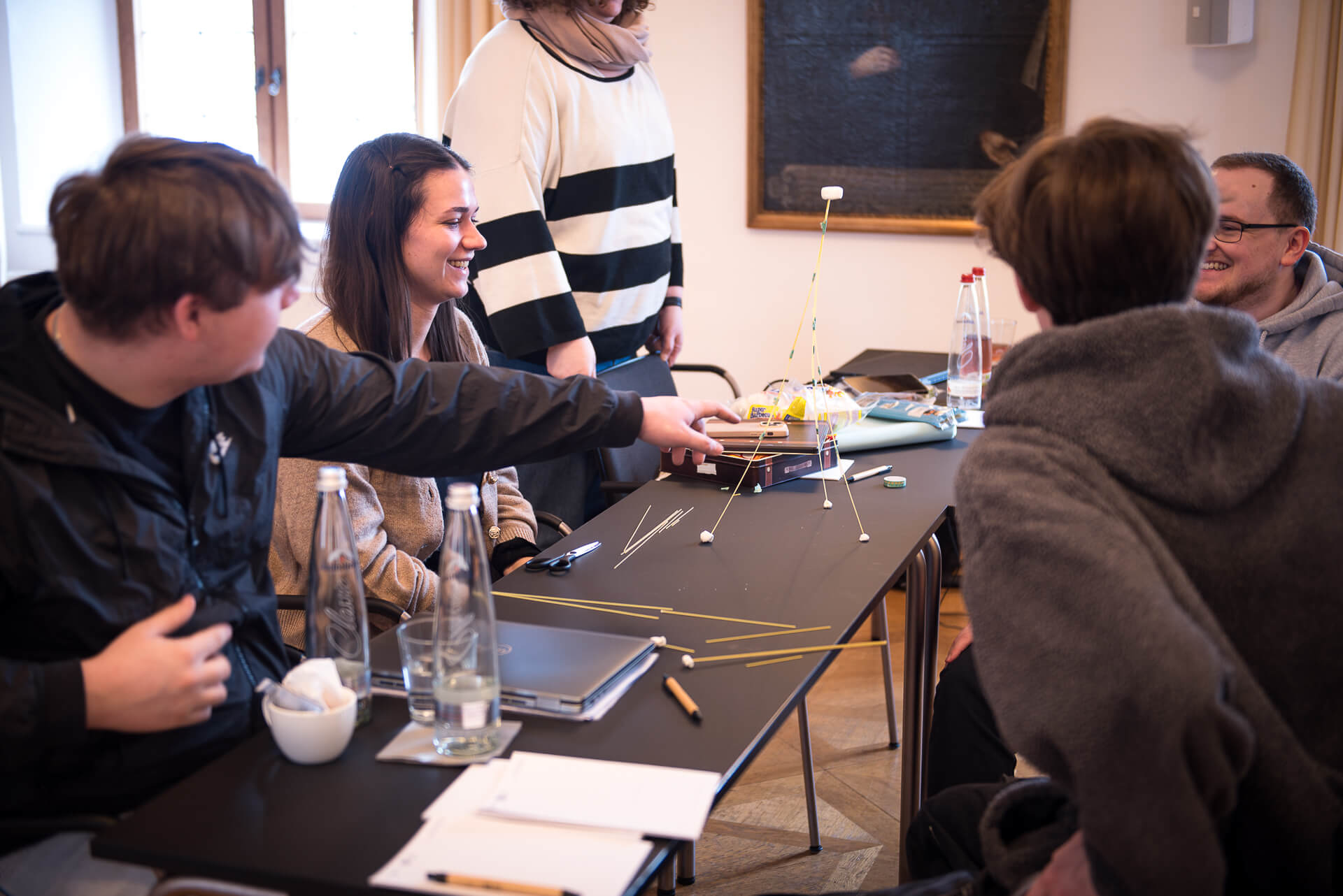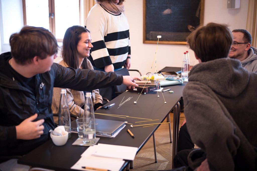 Im Teambuilding „Kick-off: Better Together“ ist Fingerspitzengefühl gefragt: Man nehme ein Marshmallow, 20 Spaghettis und 1 m Washitape und baue einen Turm.