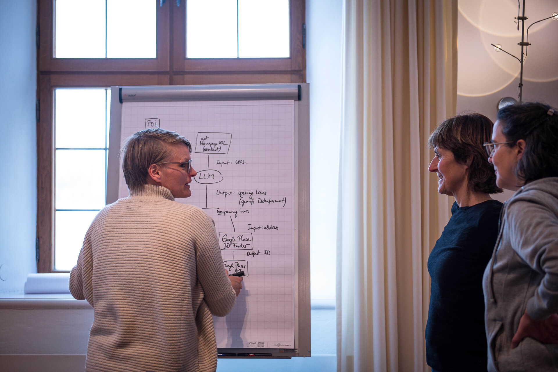 Im nächsten Schritt haben wir uns n8n genauer angesehen. Dabei handelt es sich um ein Open-Source-Tool zur Workflow-Automatisierung, mit dem sich verschiedene Apps und Datenquellen relativ schnell und mit wenig Code verbinden lassen. In Teams entwickelten wir daraufhin Use Cases, die sich mit n8n umsetzen ließen. Ideen waren zum Beispiel ein Assistent, der freie Termine überprüft und neue Termine automatisch in eine Liste einträgt, oder eine KI, die aktuelle Nachrichten sammelt und selbstständig als positiv oder negativ bewertet. Die Umsetzung der Prototypen verlief dabei mal mehr, mal weniger reibungslos. Grundsätzlich war es sehr einfach, Apps innerhalb eines Workflows zu verknüpfen. Anspruchsvoller wurde es jedoch bei der konkreten Ausgestaltung und Spezifizierung der Abläufe – insbesondere für Teilnehmende ohne tiefere technische Vorkenntnisse.